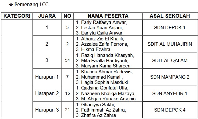 Lebih lanjut, Saefulloh memberikan fakta penting bahwa seluruh juara pertama dari masing-masing cabang lomba berhak melaju ke tingkat Kota Depok. Kesempatan ini menjadi motivasi besar bagi para peserta untuk menampilkan kemampuan terbaiknya.