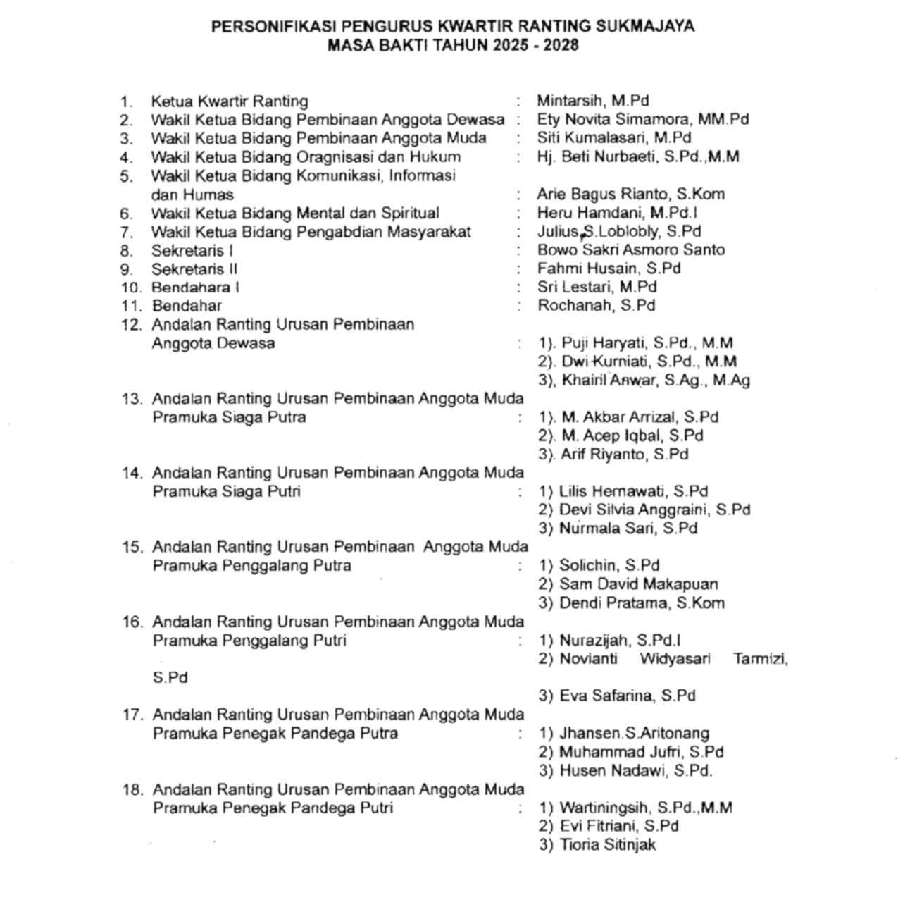 Jabaran.id – Kwartir Ranting (Kwaran) Kecamatan Sukmajaya resmi memasuki era kepemimpinan baru. Pengurus untuk periode 2025-2028 telah dilantik, dengan Mintarsih secara resmi mengambil alih tampuk pimpinan, menggantikan Maman Sutarman yang telah menyelesaikan masa bakti kepengurusannya. Peralihan kepemimpinan ini menjadi momentum untuk menyusun strategi pengembangan Gerakan Pramuka yang lebih progresif di wilayah tersebut.